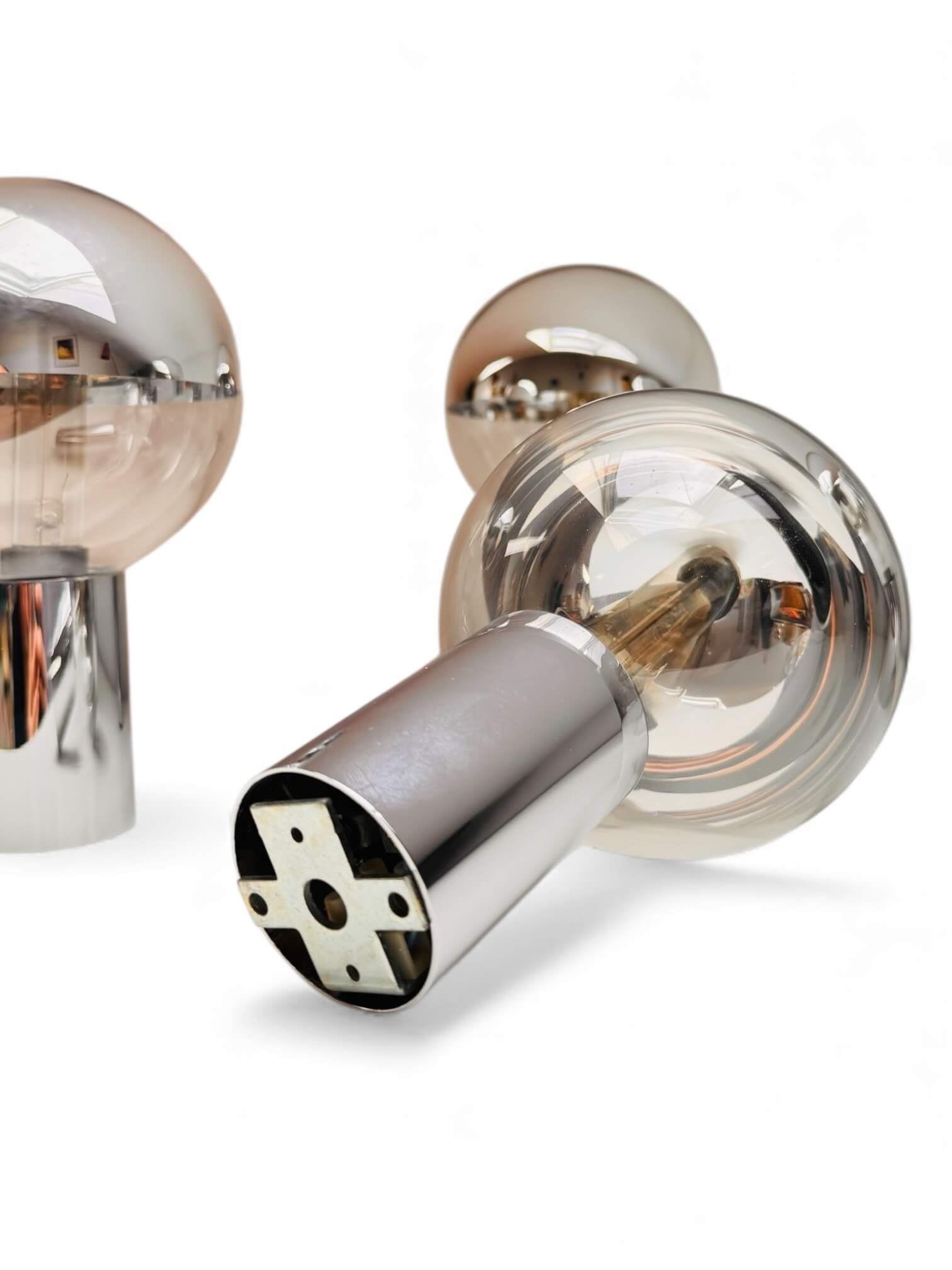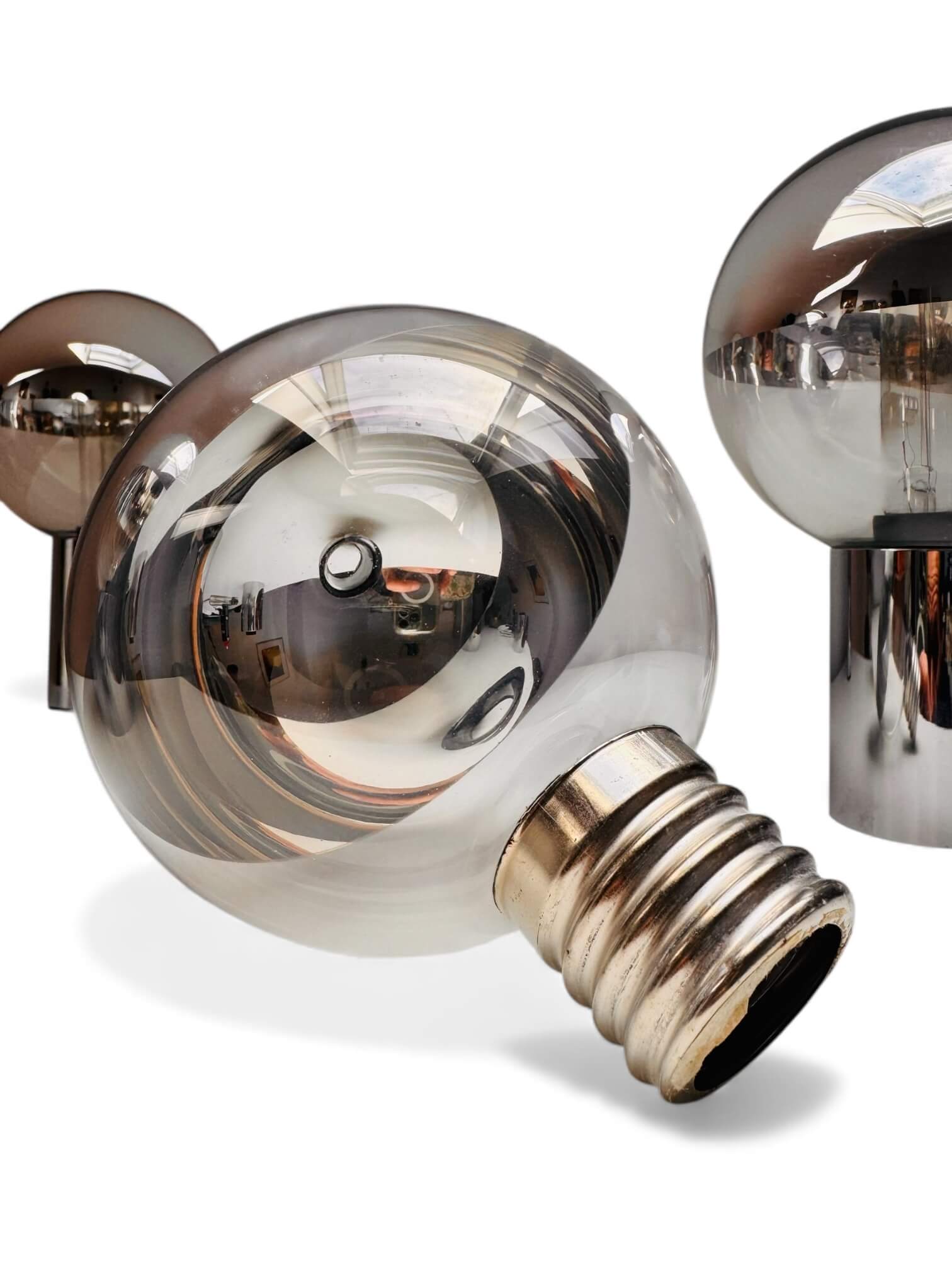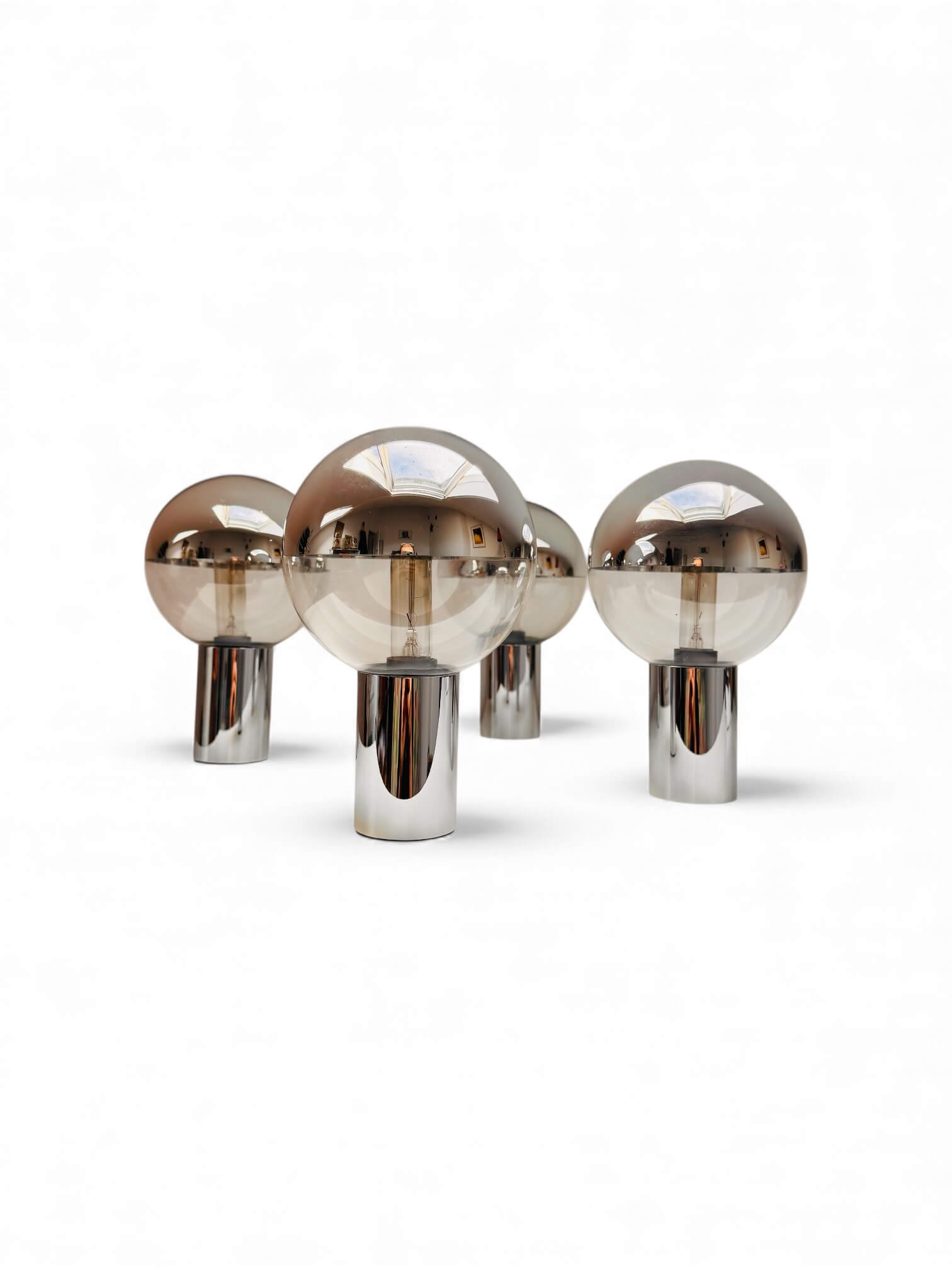 Ensemble de 4 appliques murales de Motoko Ishii fabriquées en Allemagne pour Staff Leuchten. Elles datent des années 60 / 70, époque « Space Age ». Elles sont composées d’un pied chromé cylindrique et d’un globe dévissable en verre cristallin. Chaque globe a la particularité d’avoir une moitié miroitante. Elles sont toutes électrifiées et fonctionnent avec des ampoules de 25W petits culots à vis (non fournies). Elles peuvent être installées horizontalement ou verticalement et, parce qu’elles distribuent une lumière claire et brillante, nécessitent d’être équipées d’une ampoule de faible puissance. Un design épuré qui s’intègre parfaitement dans tout type d’intérieur.
