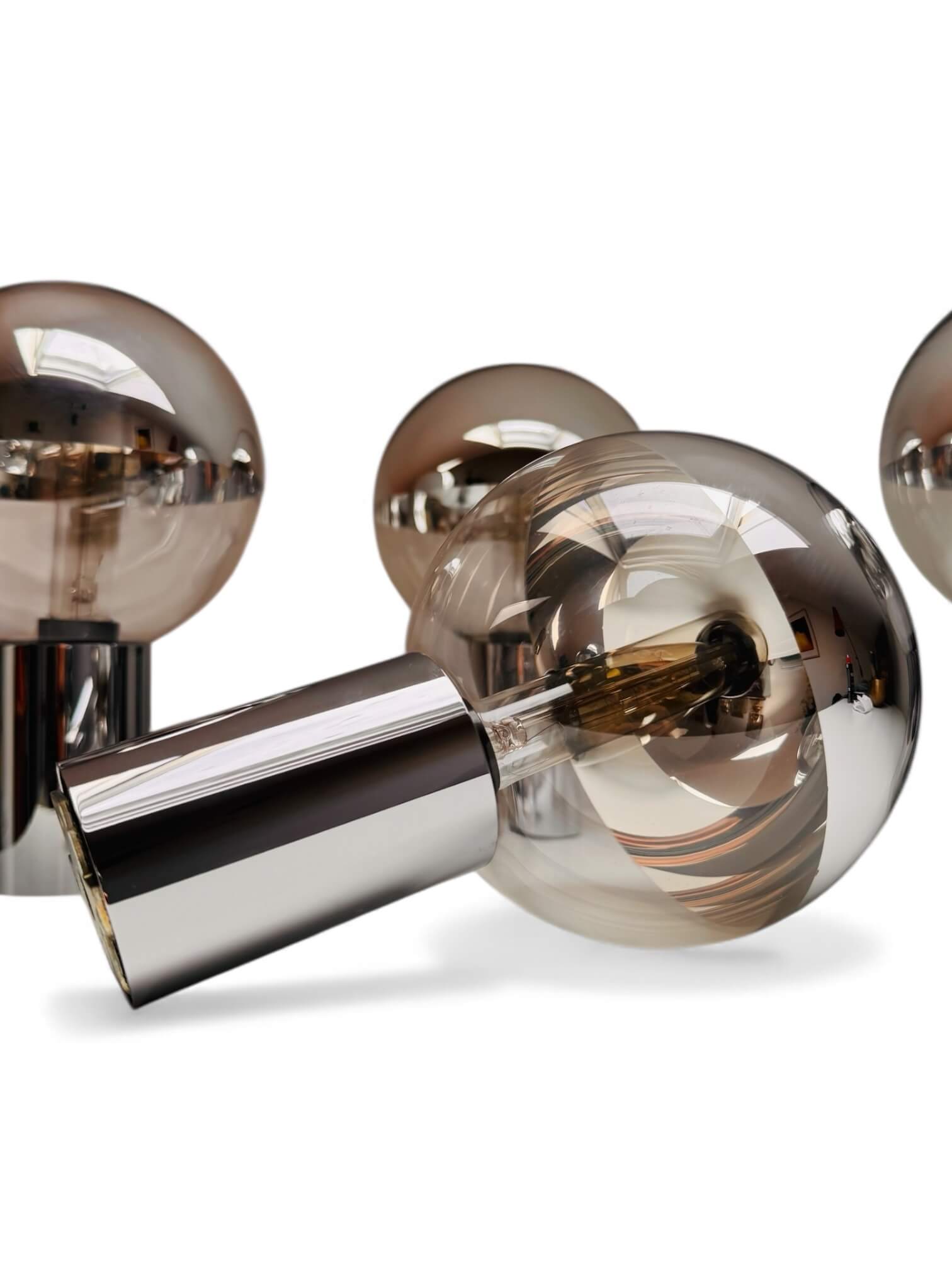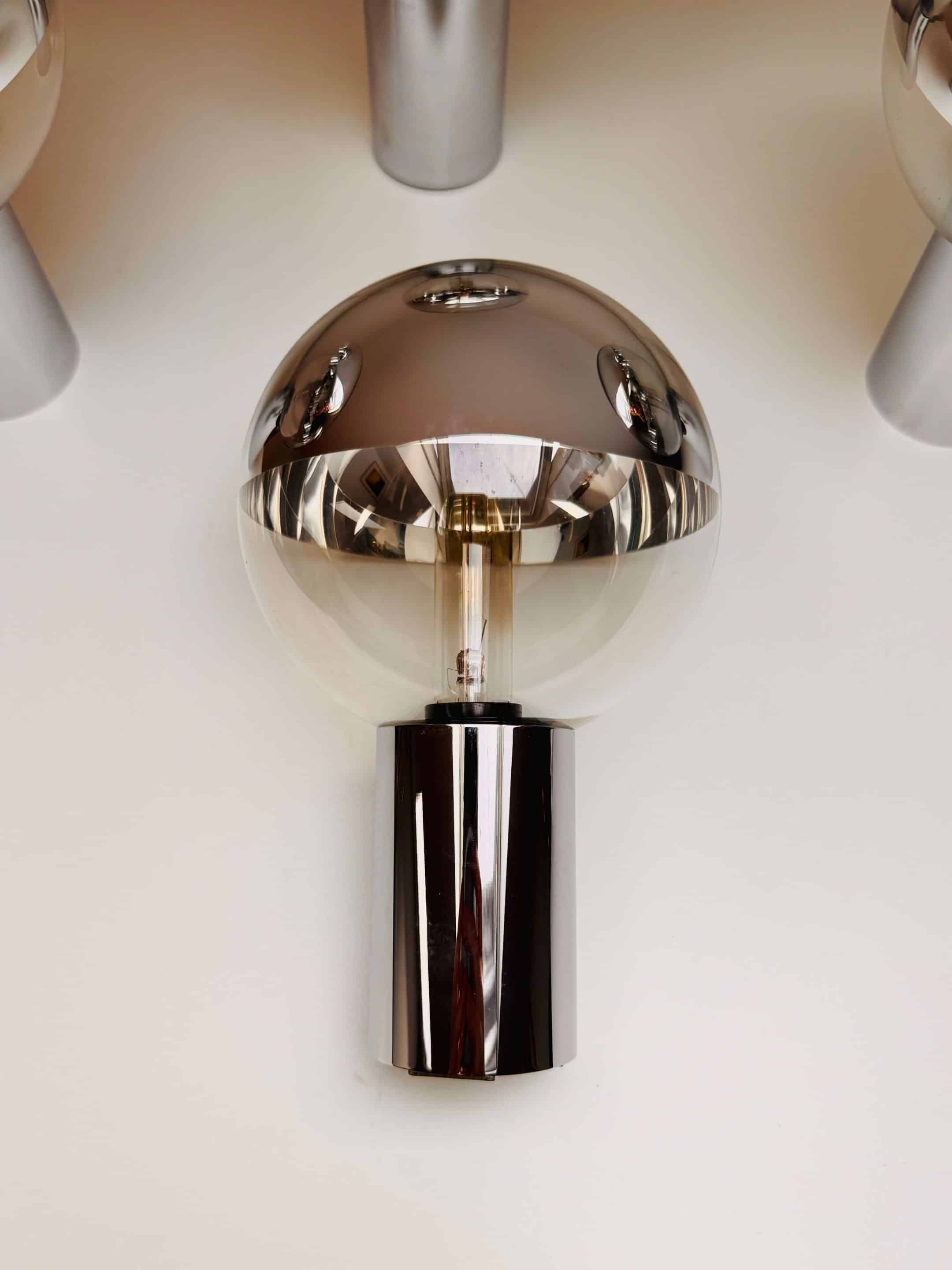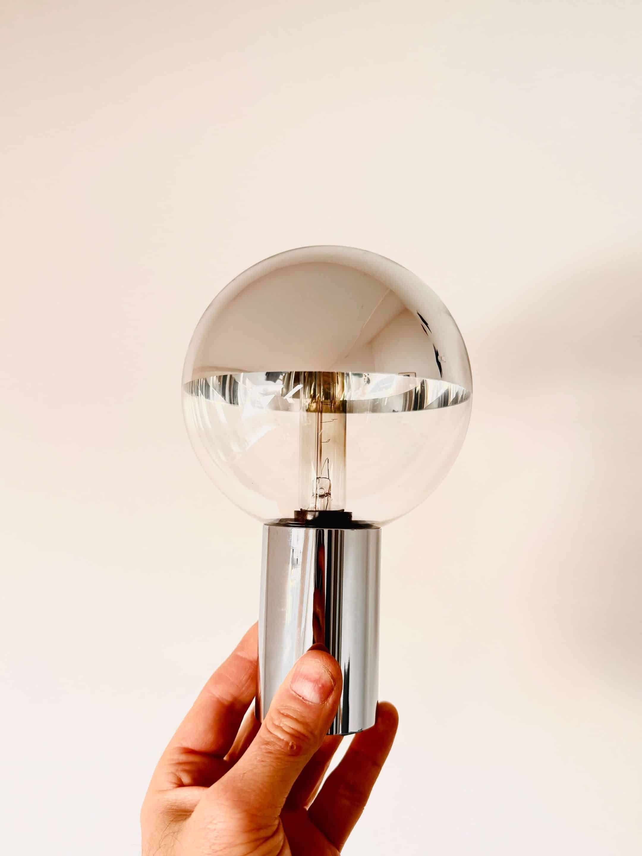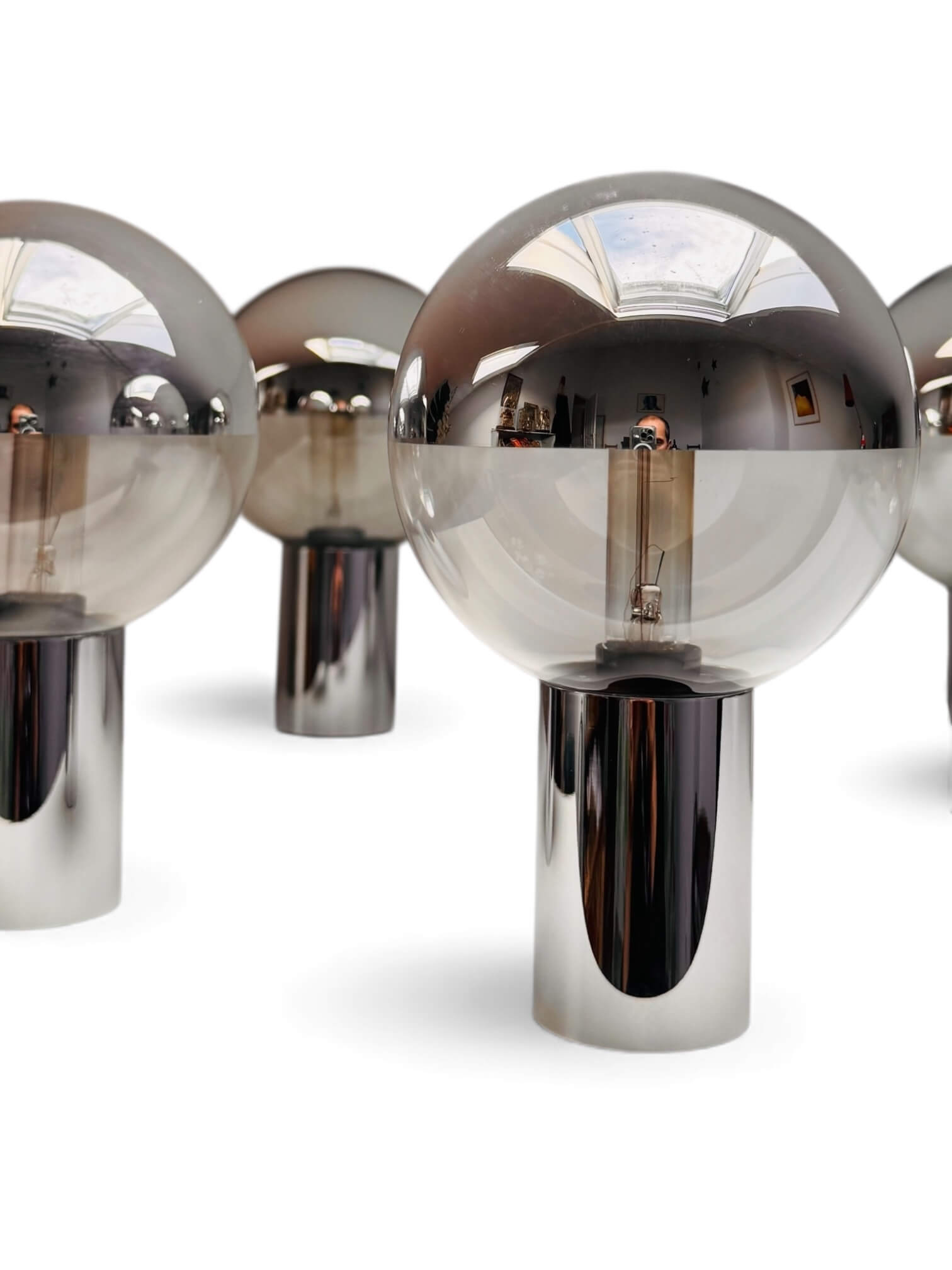 Ensemble de 4 appliques murales de Motoko Ishii fabriquées en Allemagne pour Staff Leuchten. Elles datent des années 60 / 70, époque « Space Age ». Elles sont composées d’un pied chromé cylindrique et d’un globe dévissable en verre cristallin. Chaque globe a la particularité d’avoir une moitié miroitante. Elles sont toutes électrifiées et fonctionnent avec des ampoules de 25W petits culots à vis (non fournies). Elles peuvent être installées horizontalement ou verticalement et, parce qu’elles distribuent une lumière claire et brillante, nécessitent d’être équipées d’une ampoule de faible puissance. Un design épuré qui s’intègre parfaitement dans tout type d’intérieur.