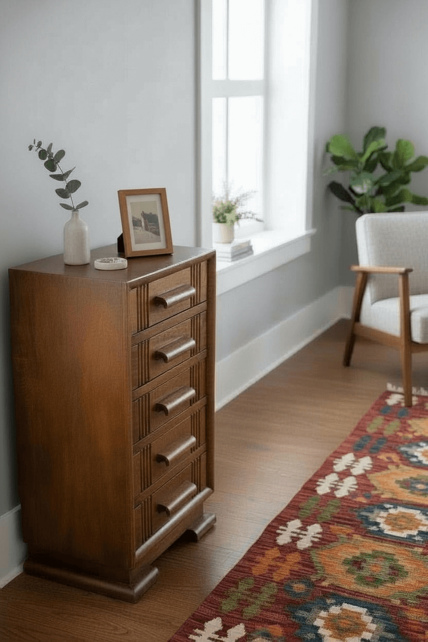 Charmant chiffonnier de style Art Déco, vers 1940. Doté de 5 tiroirs, ce meuble de rangement est en bois recouvert d’un placage de chêne. On aime les détails comme ses grandes poignées au-dessus arrondi, son piétement rectangulaire original et les façades des tiroirs joliment travaillées.