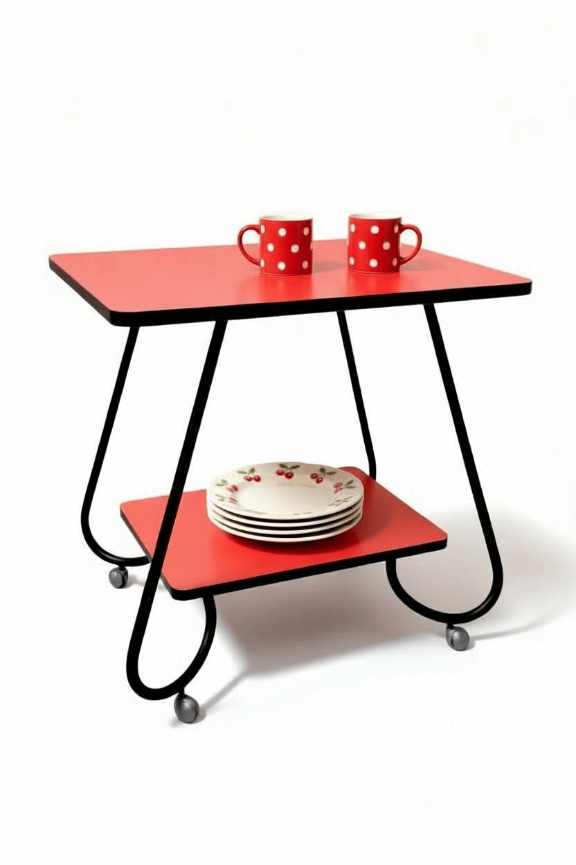 Jolie desserte, table roulante vintage au look très 50’s. Les pieds sont en métal tubulaire noir de forme volute. Les deux plateaux sont en formica rouge aux contours noirs. Elle est très maniable et parfaitement fonctionnelle. Une belle pièce 100% vintage qui donnera une touche rétro à votre intérieur.