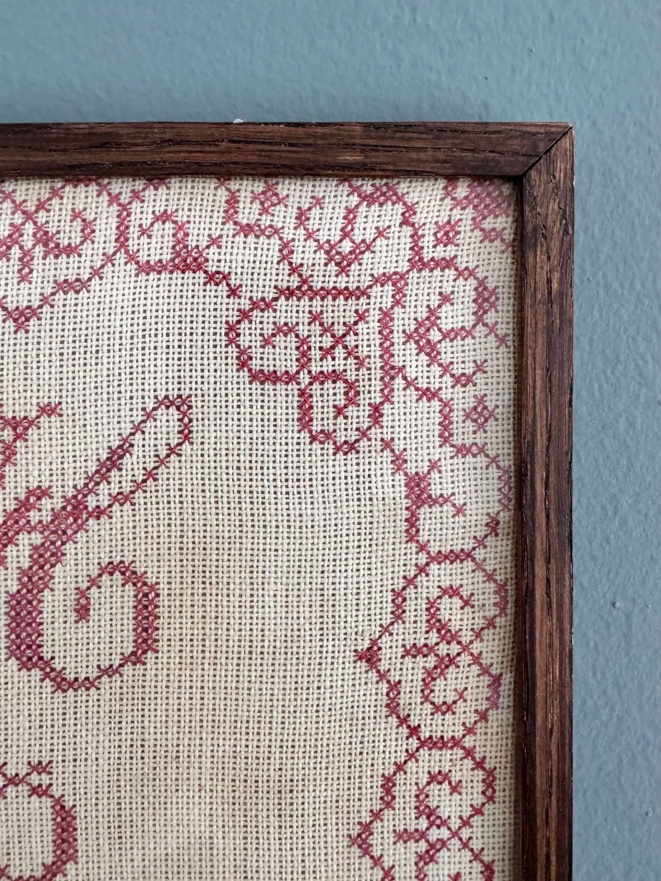 Cette broderie est présentée encadrée et sous verre. Le cadre est en chêne. Elle est en très bon état de conservation sans décoloration et sans accrocs. Le dos en bois est très propre.