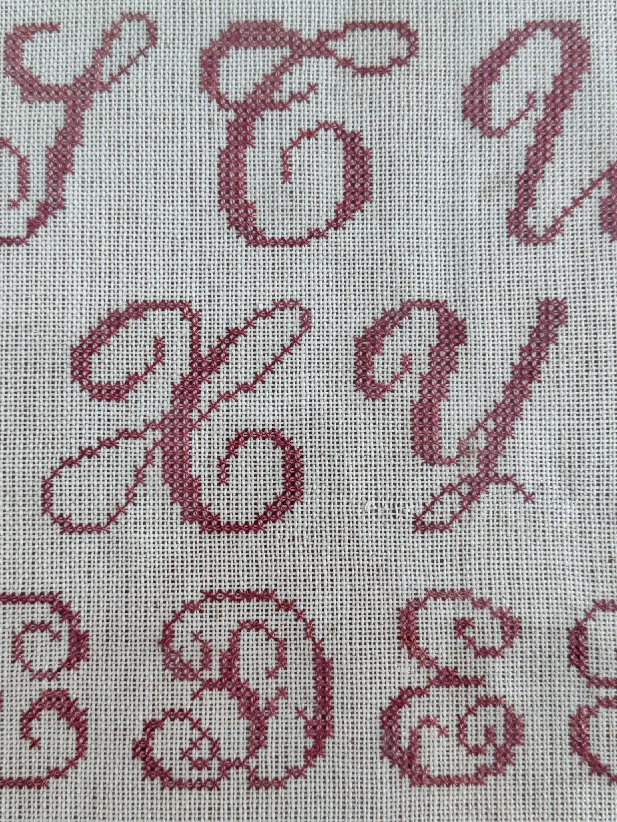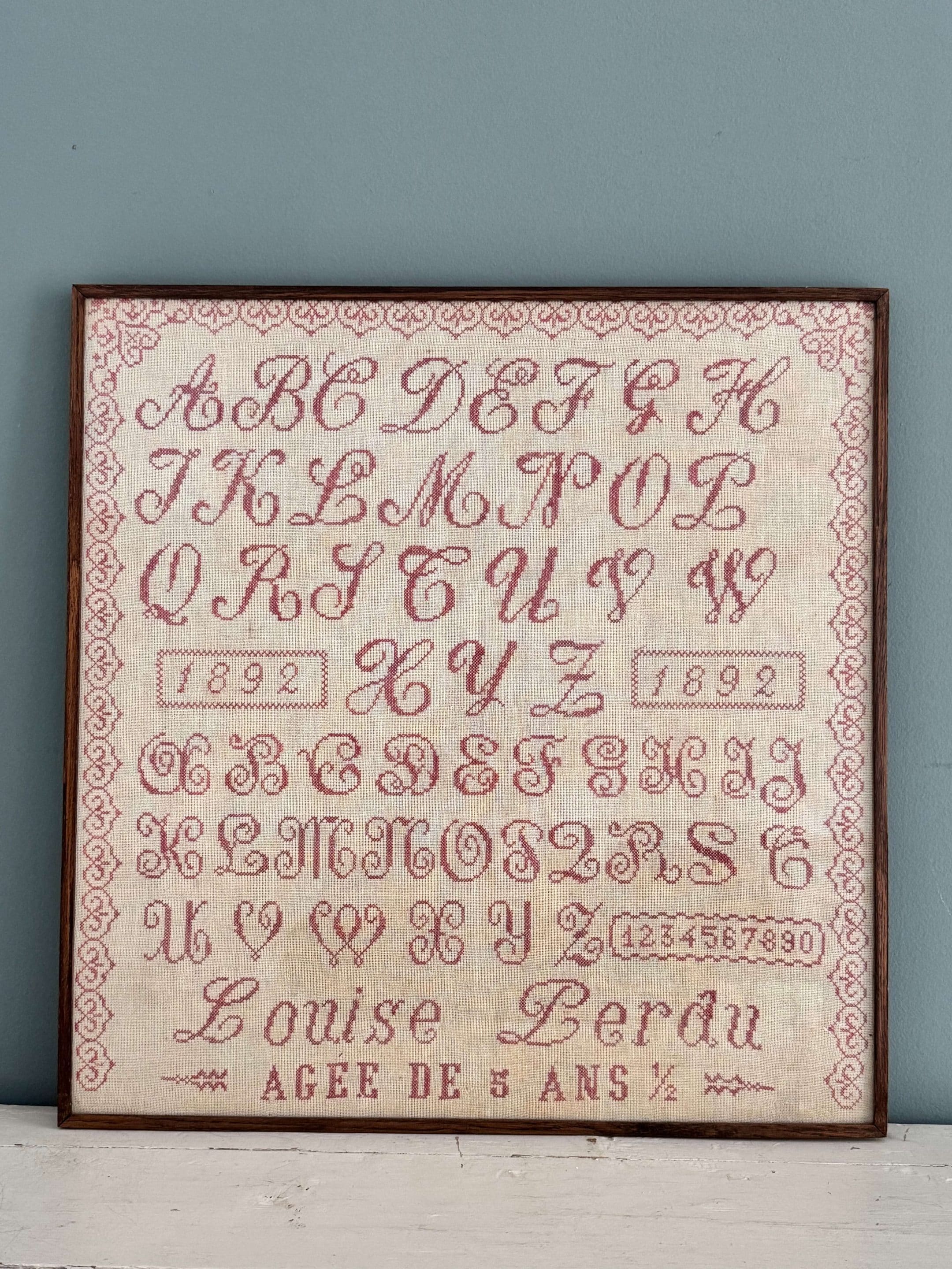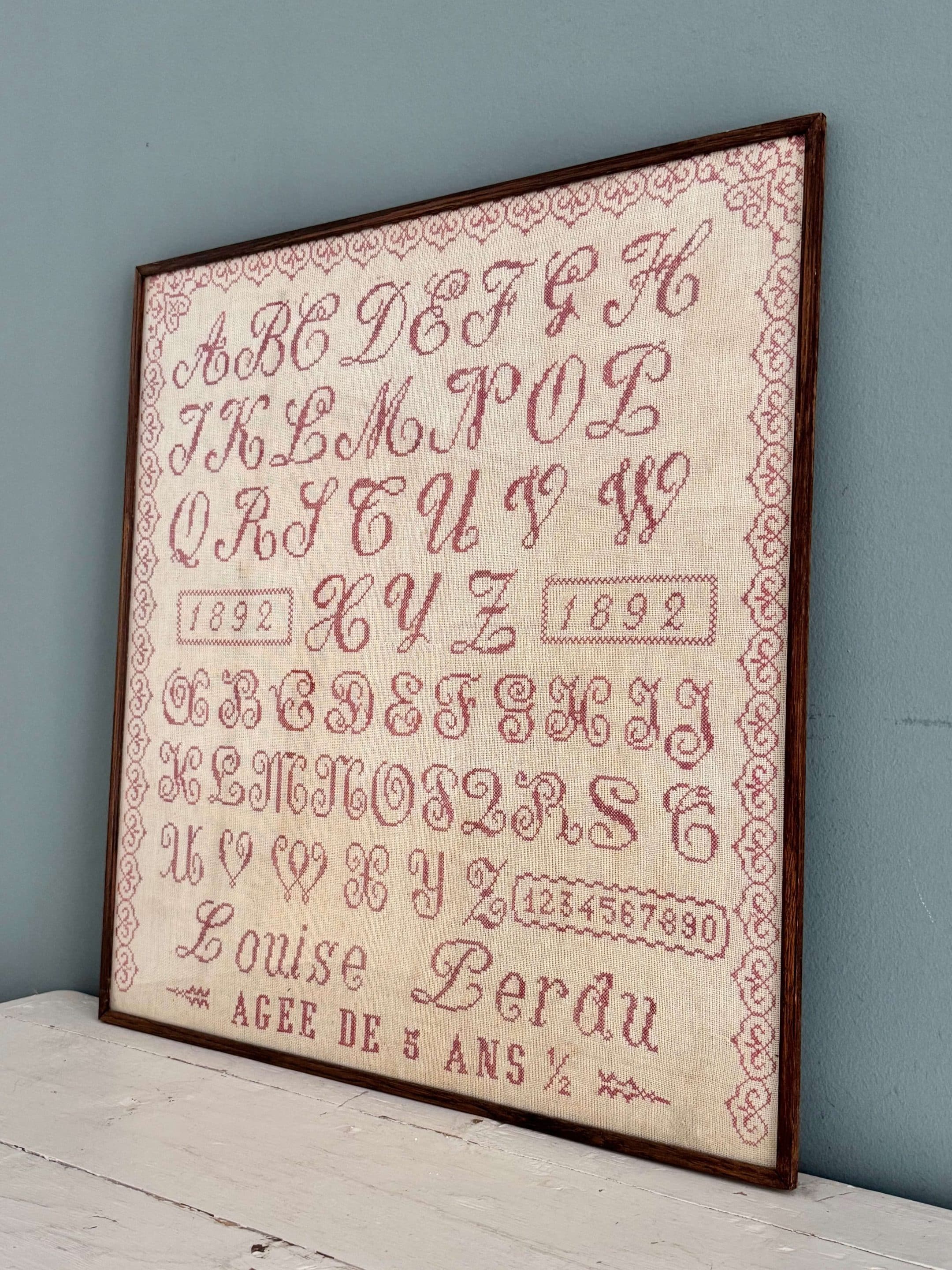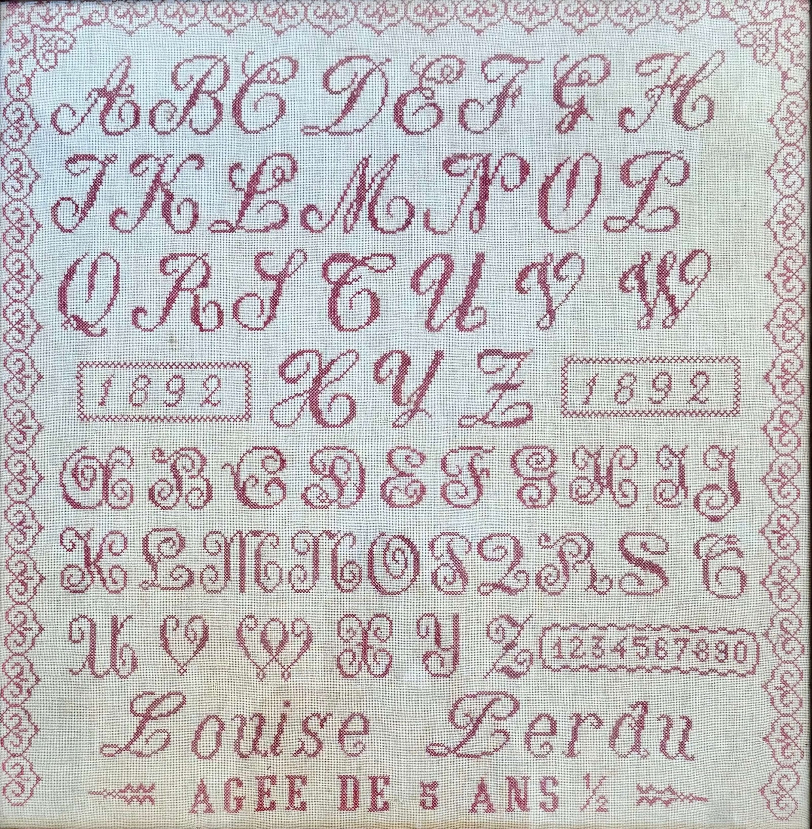 Grand abécédaire, marquoir brodé au point de croix. Il est daté de 1892. De grande taille, c’est un bel ouvrage très charmant, finement exécuté au fil de laine rouge sur un canevas de couleur crème. Les couleurs sont restées vives malgré son ancienneté. La lettre « i » n’est pas représentée comme il en était l’usage au début des années 1900.