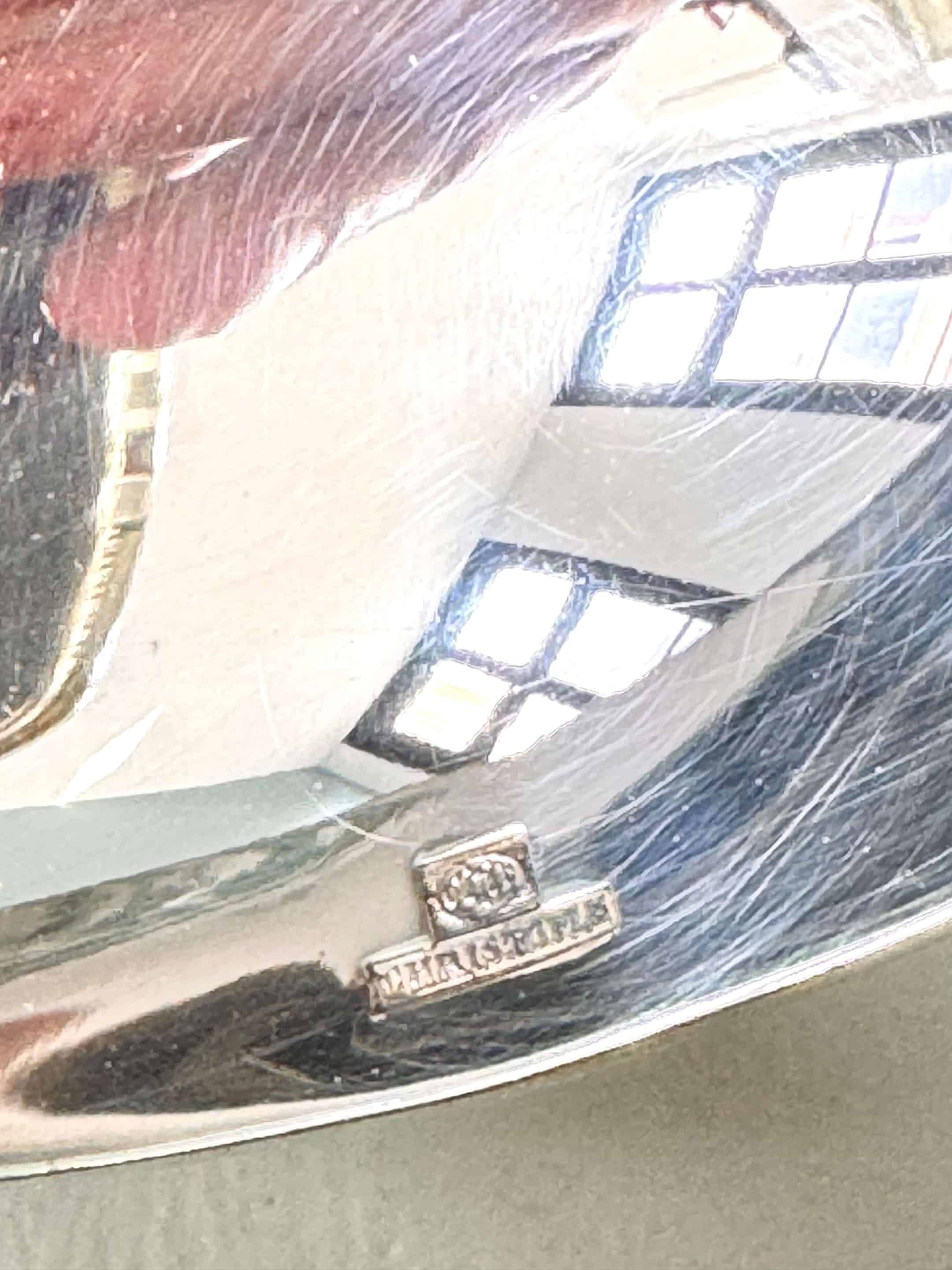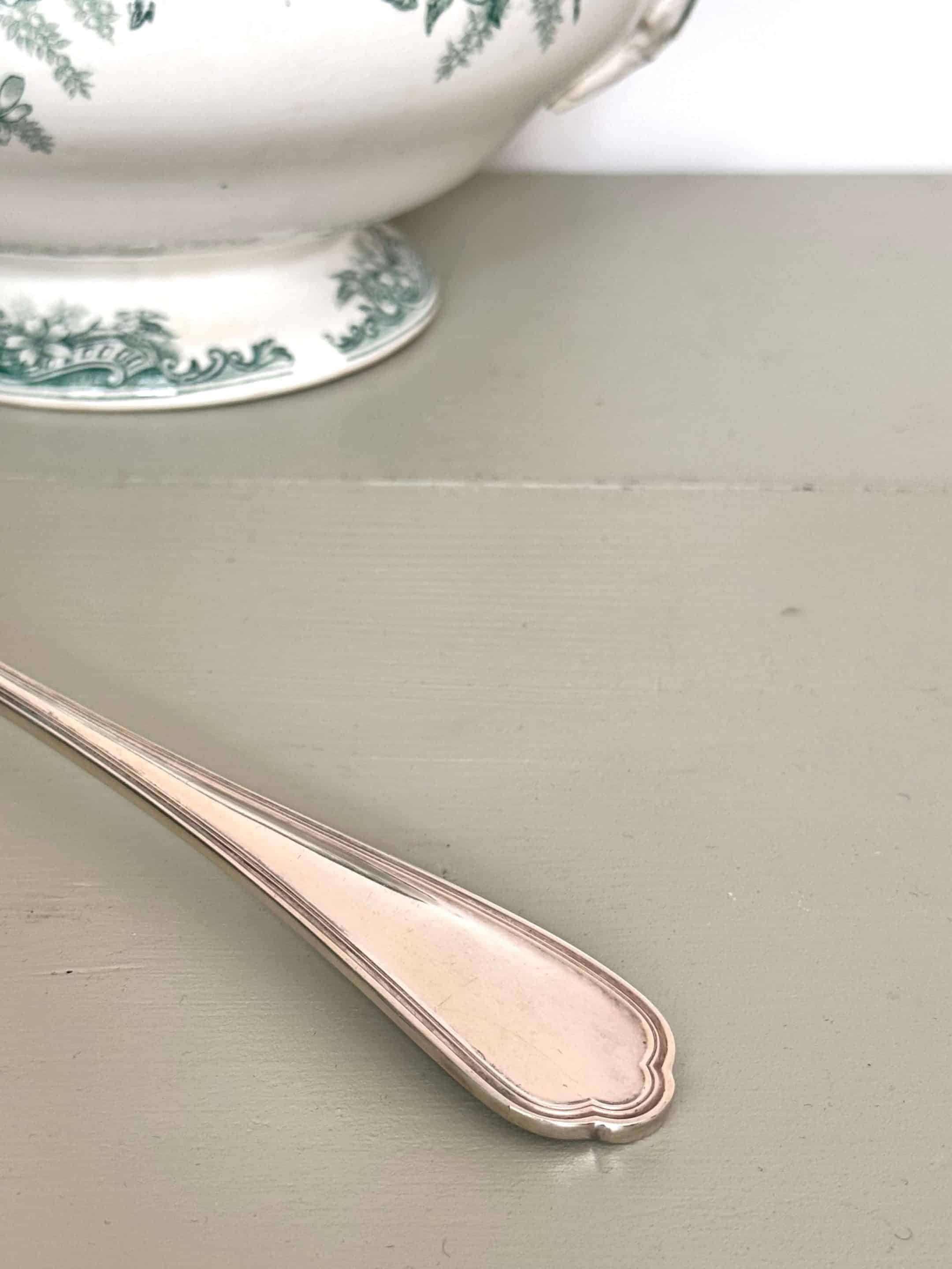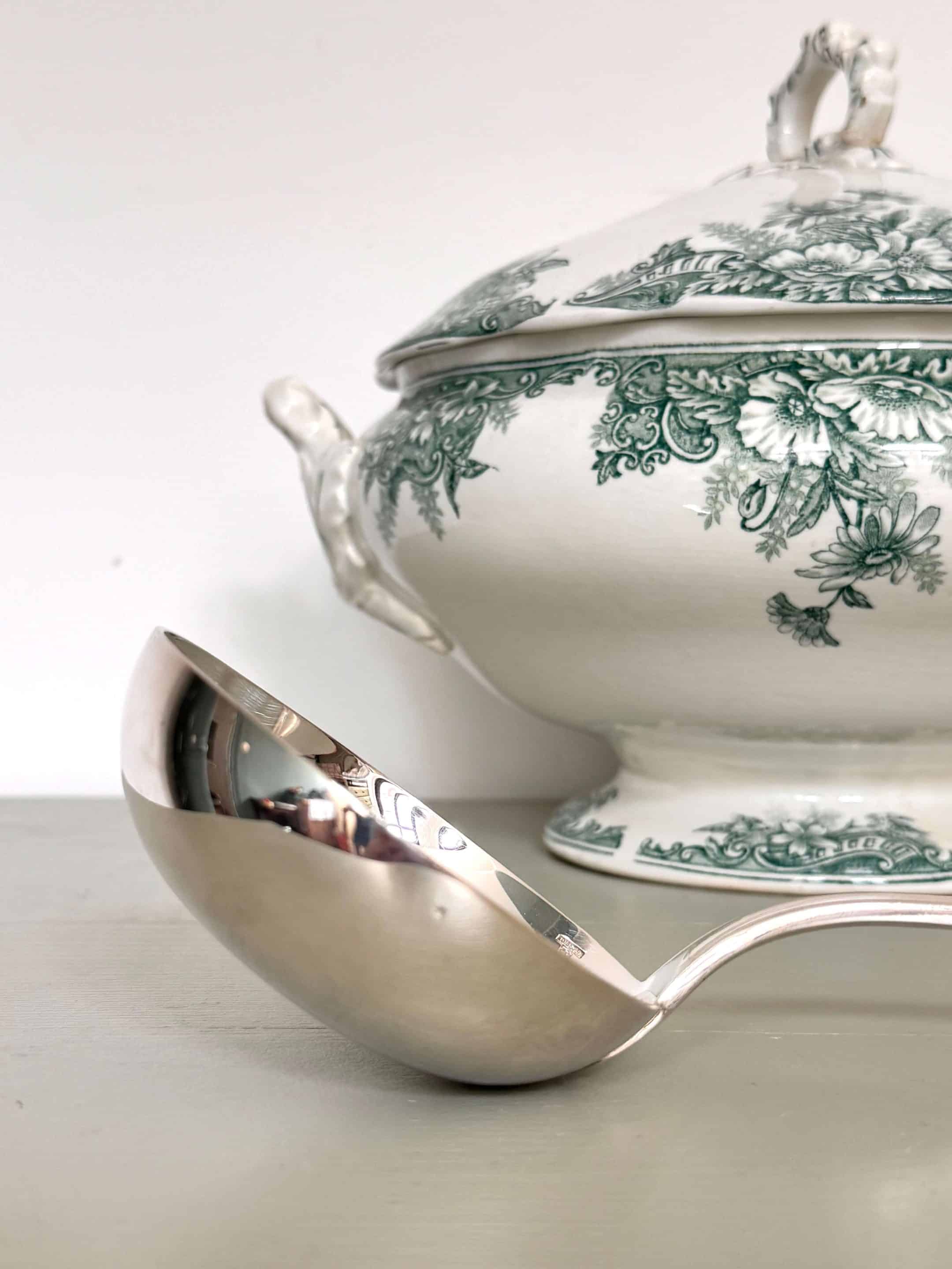 Louche à potage en métal argenté signée Christofle, modèle Spatours. Puisant son inspiration esthétique dans le XVIIIème siècle, la collection de couverts Spatours figure dans le premier catalogue Christofle en 1862. Son nom est la contraction du mot « spatule » et du mot « contour ». Il évoque assez directement le dessin de ce modèle qui figure des lignes sinueuses soulignant le galbe des couverts. La sobriété et l’harmonie des modèles de cette collection lui permettent de traverser les époques.