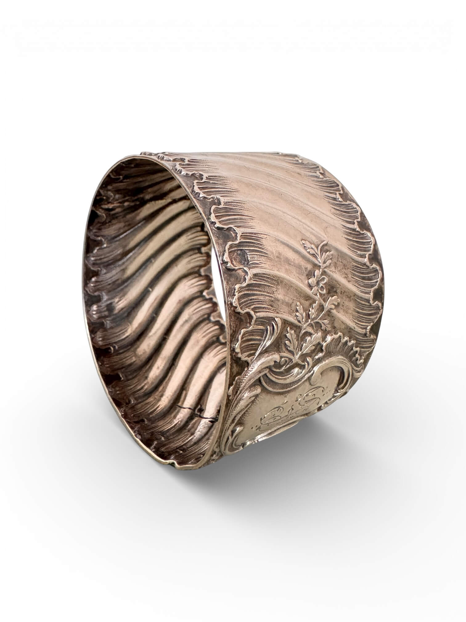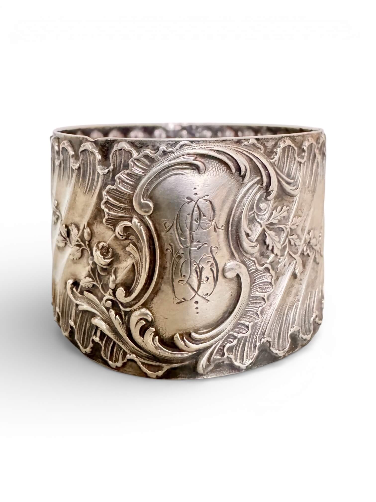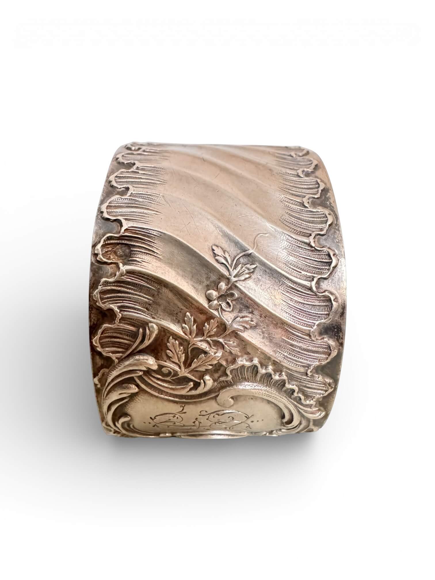 Ancien rond de serviette en argent 925. Il date du tout début XXème, typique de l’Art Nouveau. Il est monogrammé, les lettres E et L sont entrelacées. Il porte deux poinçons dont le poinçon Minerve de 1er titre et le poinçon d’orfèvre Louis Coignet (LC) représenté par une fourchette et un couteau. Louis Coignet est un maître-orfèvre actif au 20 rue Barbette à Paris entre 1893 et 1928. Il est le fils et successeur de Charles-Alfred Coignet. Il réalisa des pièces d’orfèvrerie d’un goût raffiné, inspirées des grands classiques. Depuis 1838, c’est la tête de Minerve 1er titre qui atteste de la qualité de l’argent 925/1000e. On la retrouve frappée dans un poinçon octogonal. Ce modèle est de style Louis XV à un cartel chantourné, un drapé plissé et des motifs végétaux luxuriants.