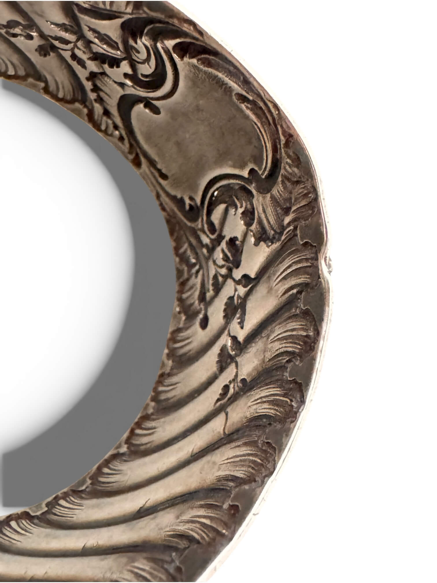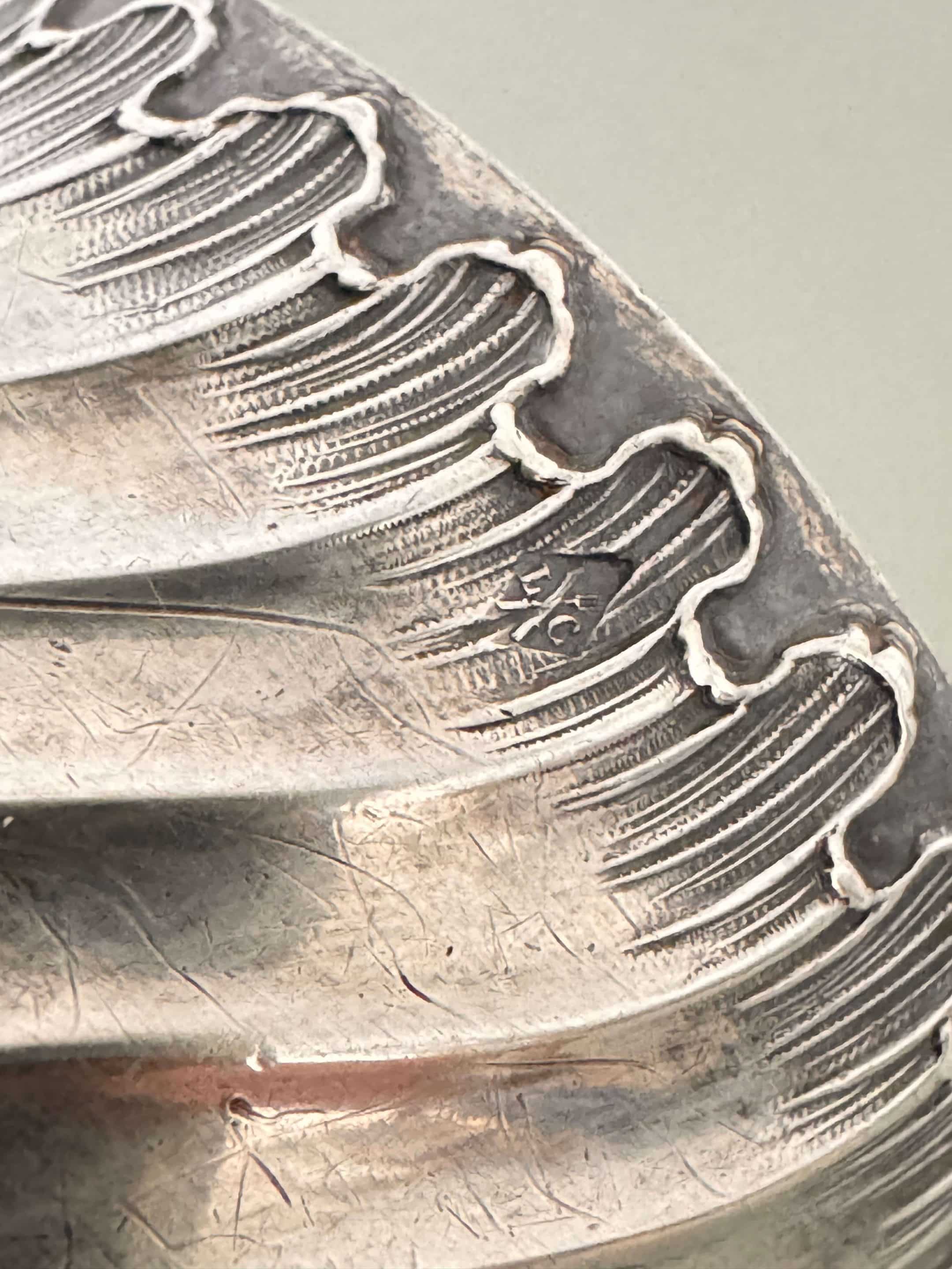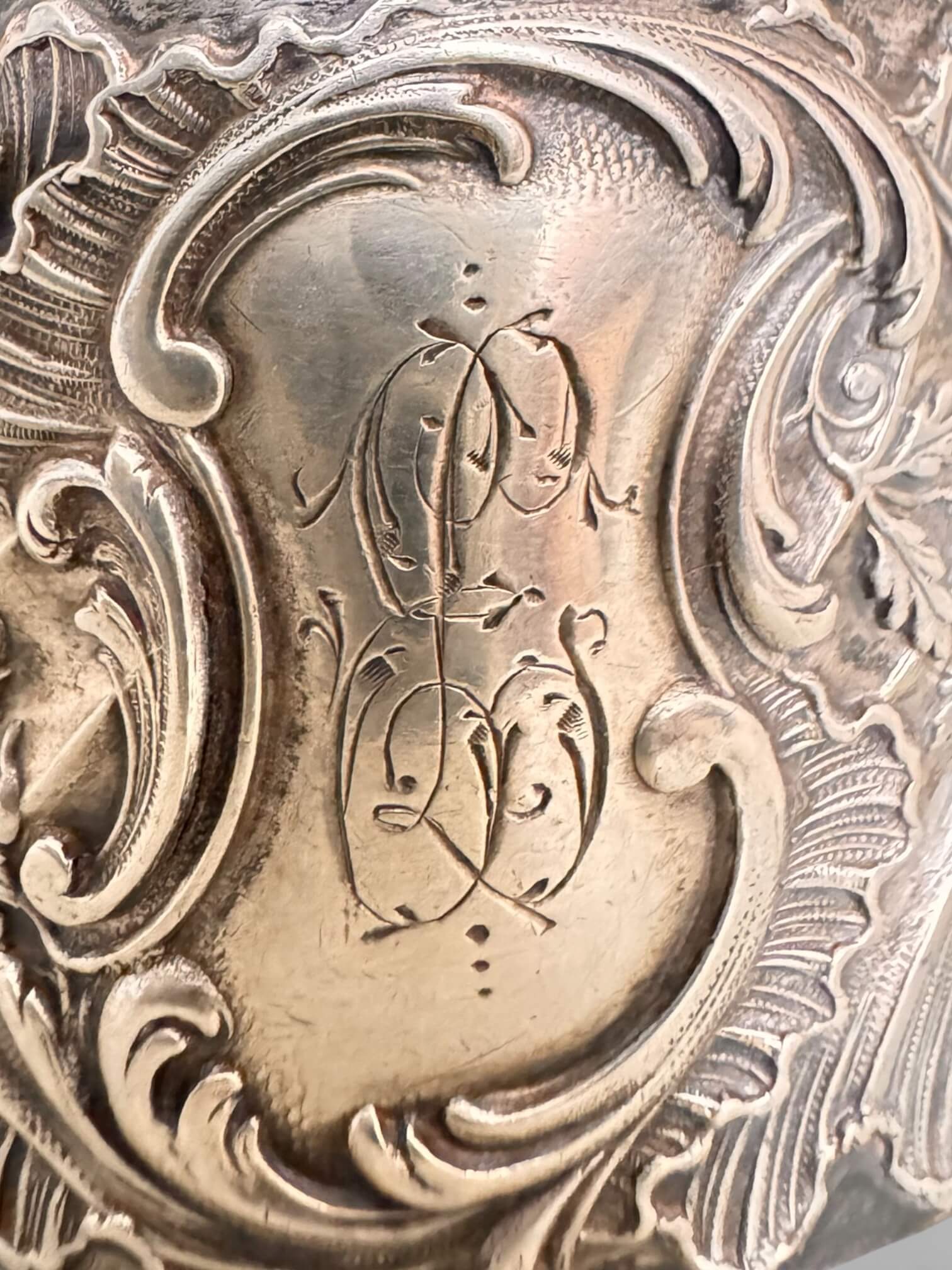 Ancien rond de serviette en argent 925. Il date du tout début XXème, typique de l’Art Nouveau. Il est monogrammé, les lettres E et L sont entrelacées. Il porte deux poinçons dont le poinçon Minerve de 1er titre et le poinçon d’orfèvre Louis Coignet (LC) représenté par une fourchette et un couteau. Louis Coignet est un maître-orfèvre actif au 20 rue Barbette à Paris entre 1893 et 1928. Il est le fils et successeur de Charles-Alfred Coignet. Il réalisa des pièces d’orfèvrerie d’un goût raffiné, inspirées des grands classiques. Depuis 1838, c’est la tête de Minerve 1er titre qui atteste de la qualité de l’argent 925/1000e. On la retrouve frappée dans un poinçon octogonal. Ce modèle est de style Louis XV à un cartel chantourné, un drapé plissé et des motifs végétaux luxuriants.