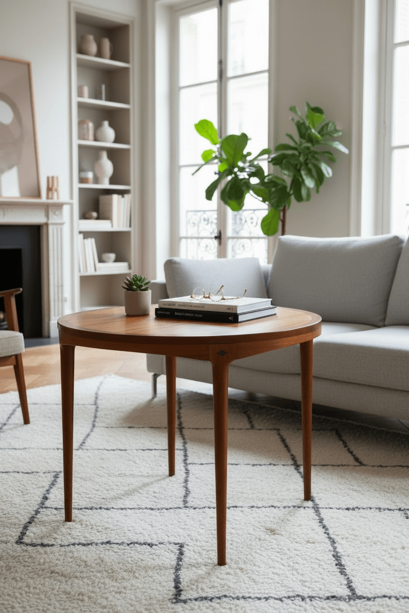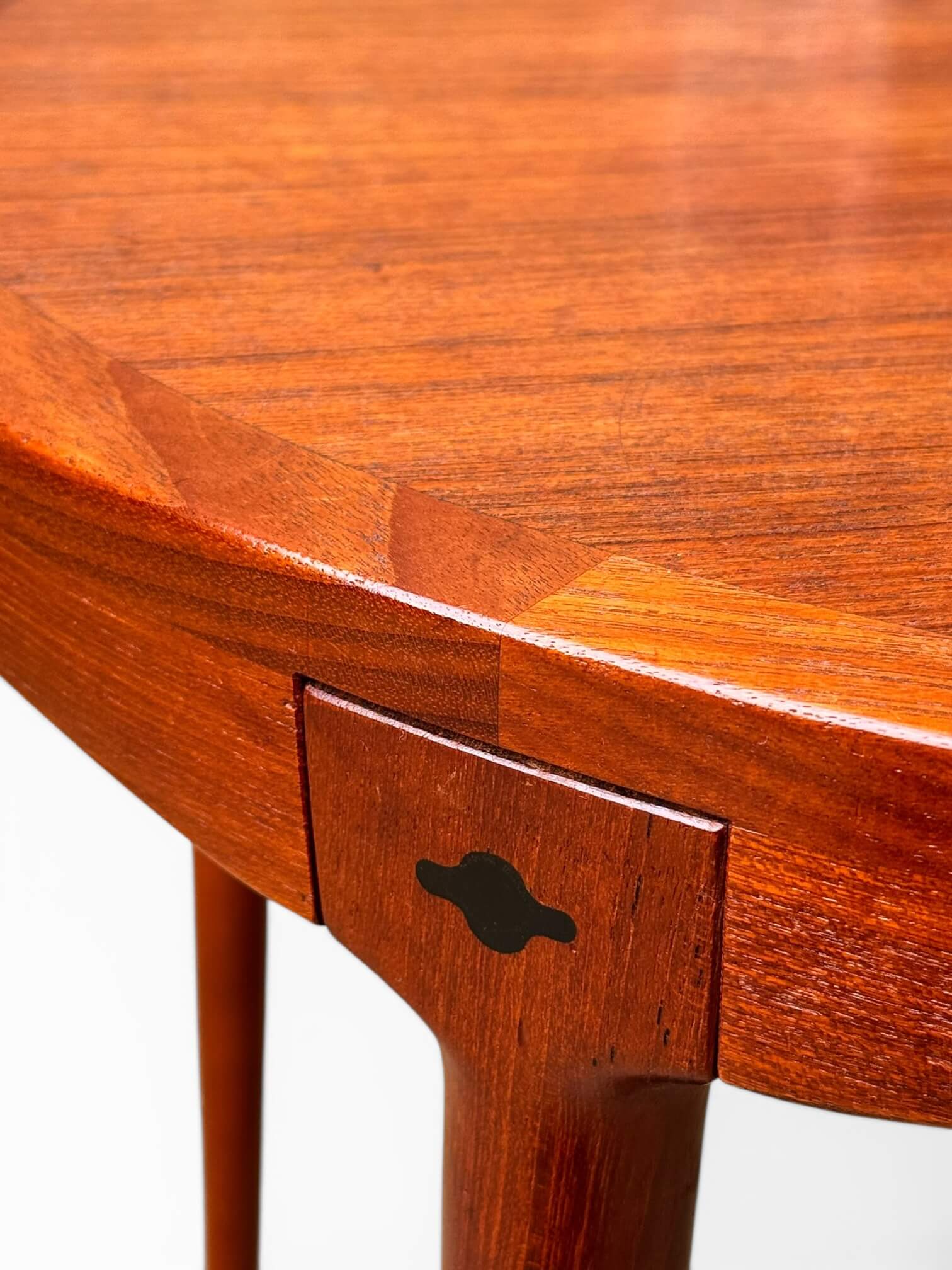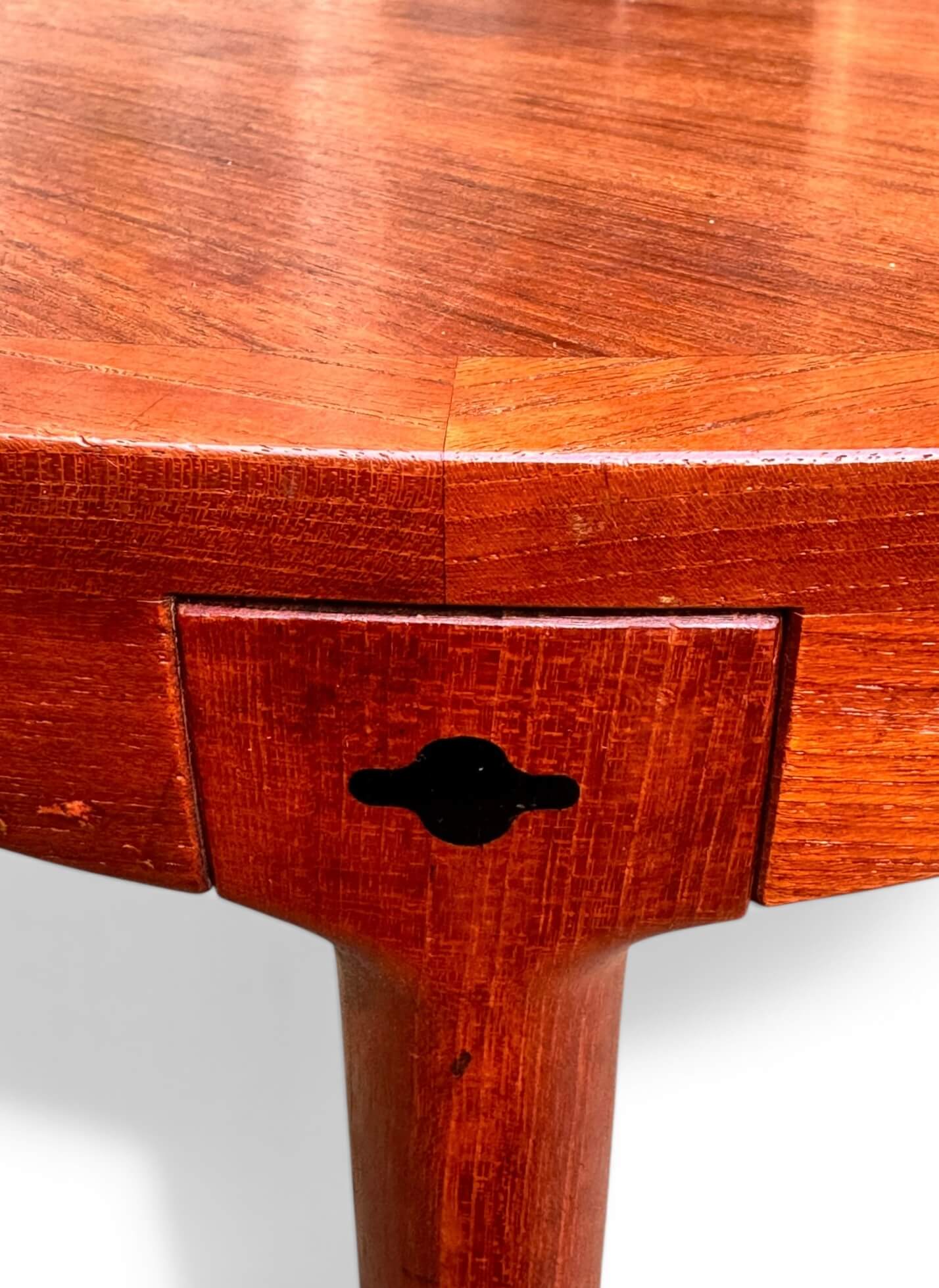 Belle table basse en teck de fabrication norvégienne. Elle date des années 60. De forme ronde, elle est montée sur 4 pieds fuselés démontables. Non signée, elle est attribuée à Haug Snekkeri pour Bruksbo. Avec de belles lignes épurées, elle est idéale en bout de canapé, table d’appoint…Un meuble vintage aux dimensions parfaites pour les petits espaces.