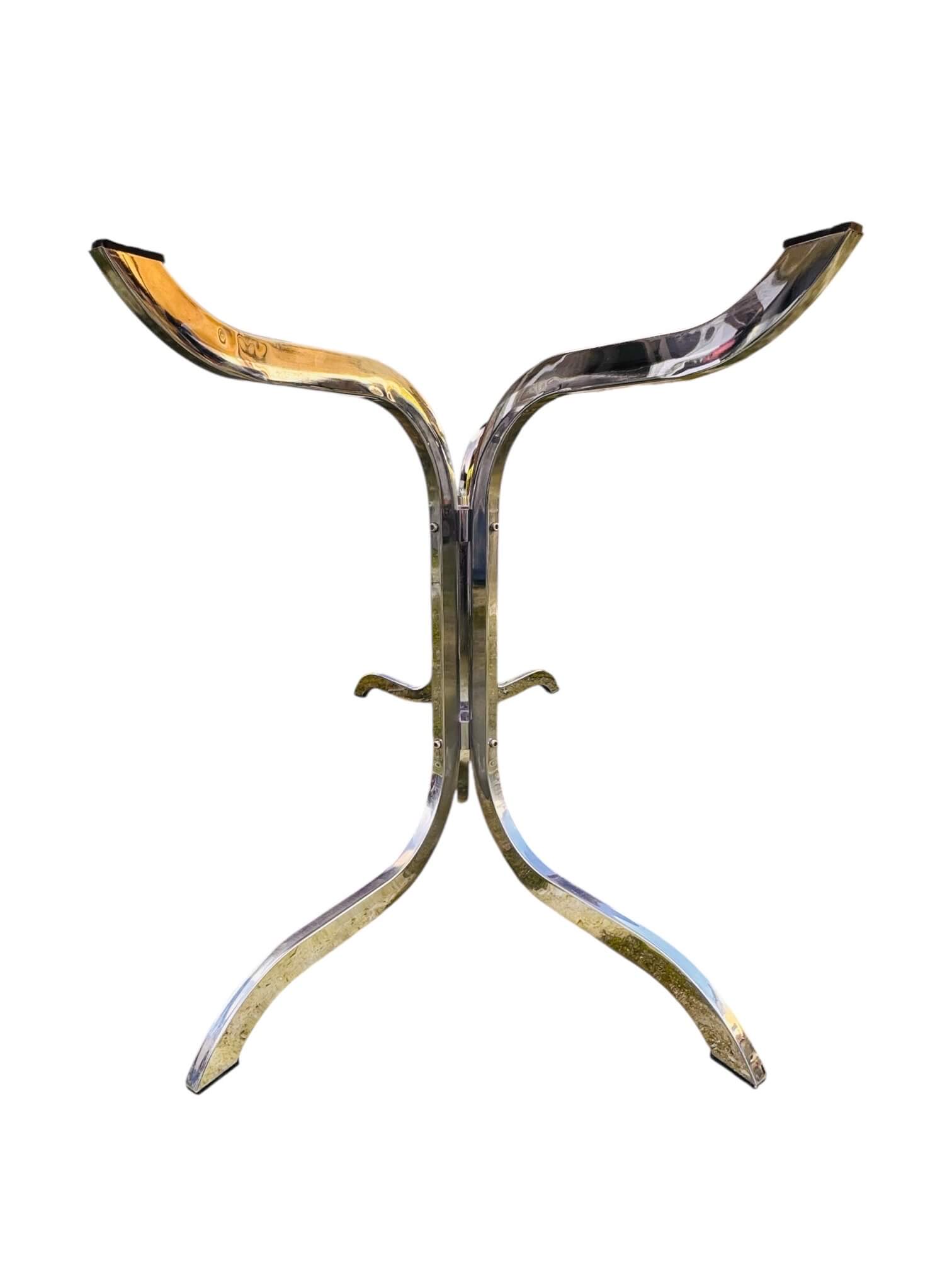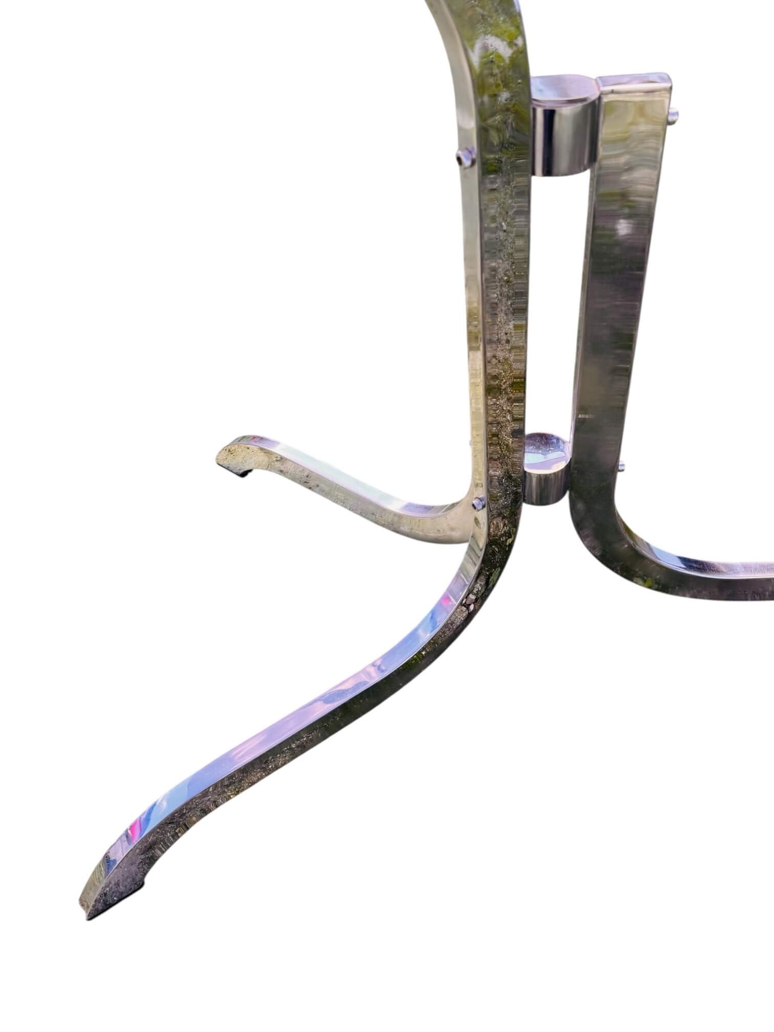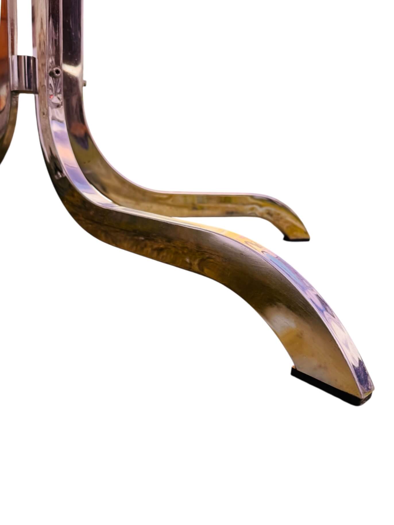 Bien stable, le plateau se pose directement sur le pied et se retire sans difficulté. Il est lourd et d’une très belle qualité. Intact et dans un état impeccable, il a toujours été protégé et ne présente pas de rayures ni traces de chocs. Le piétement chromé est superbe également. Il ne présente pas de traces d’oxydation et a conservé une belle brillance. Les pieds ont toujours leurs patins antidérapants.
