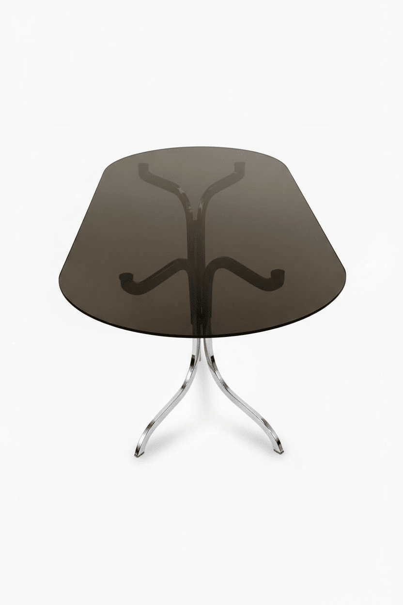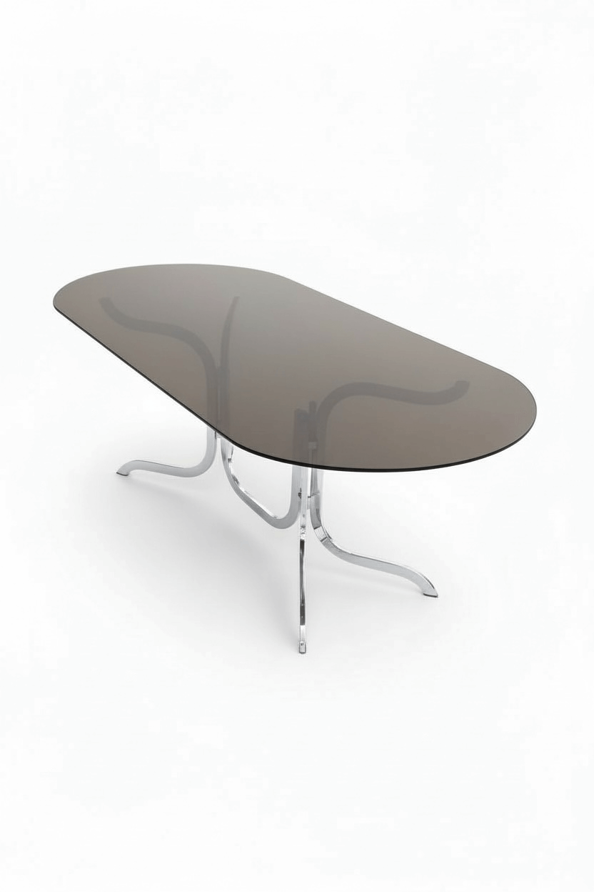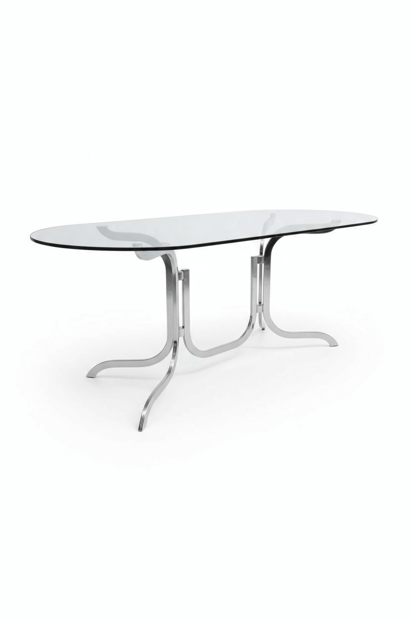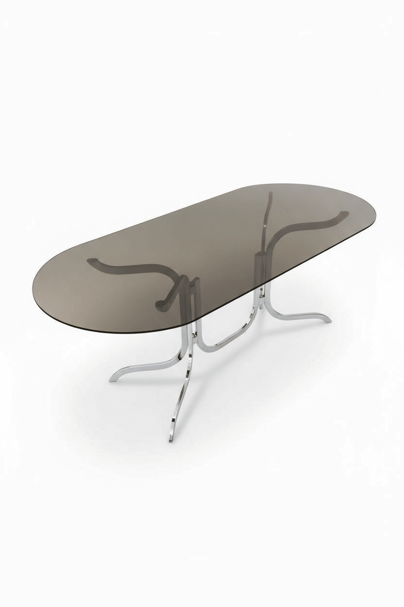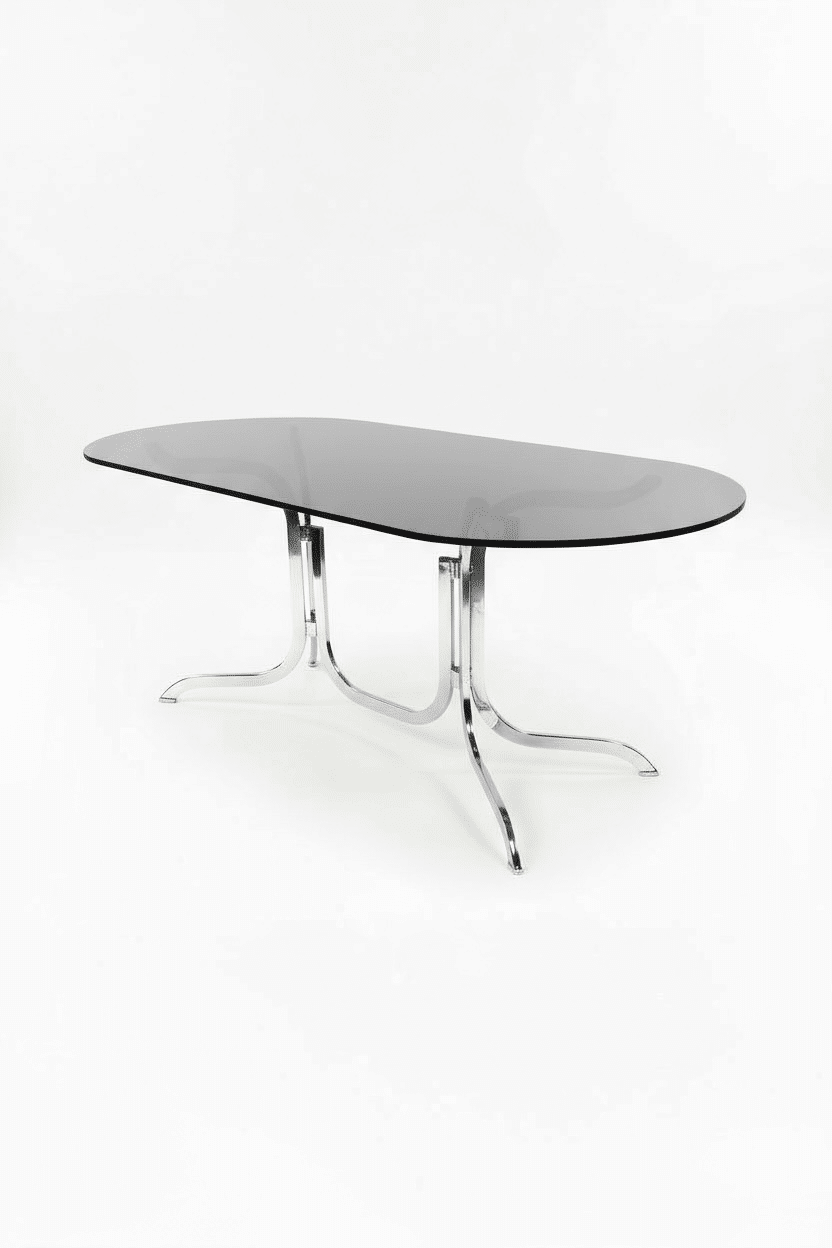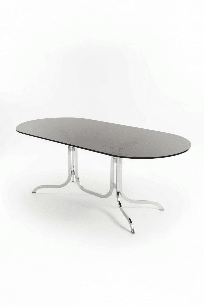 Table ovale Roche Bobois des années 70. Dans l’esprit des productions de Gastone Rinaldi, elle est dans un état remarquable. Son plateau ovale d’origine est en verre fumé. Le double piétement tubulaire arqué est en acier chromé. Avec ses formes courbes qui rappellent le courant Space Age des années 70, c’est un classique du design vintage aux lignes élégantes et contemporaines.